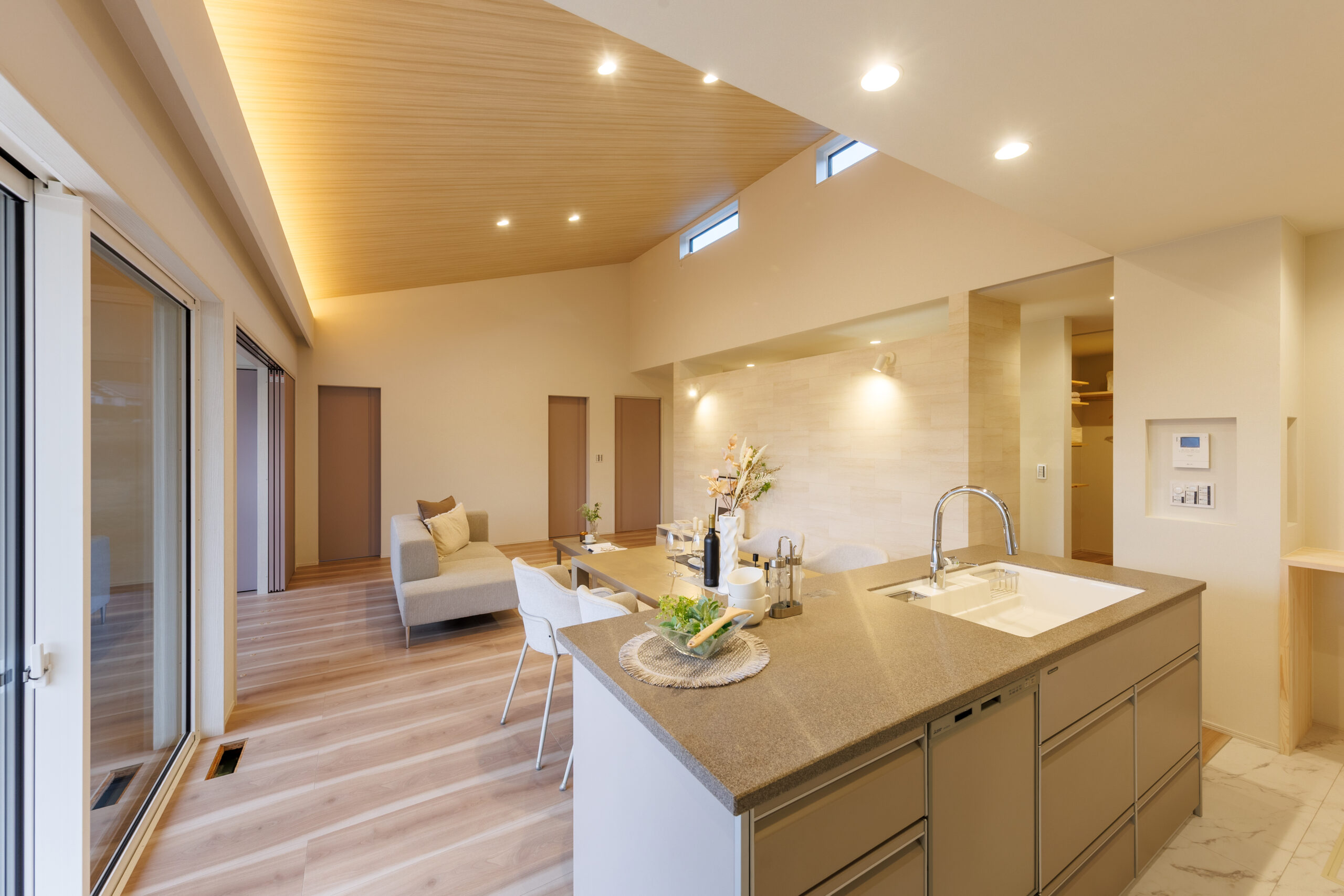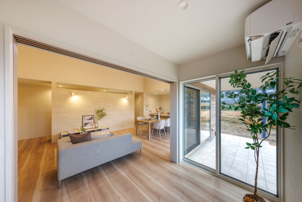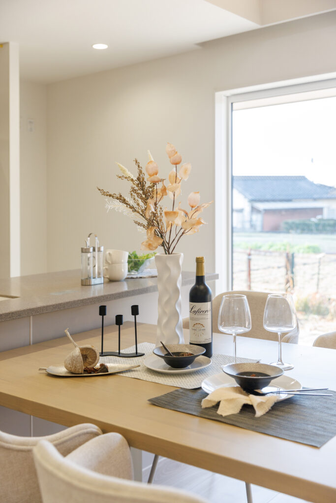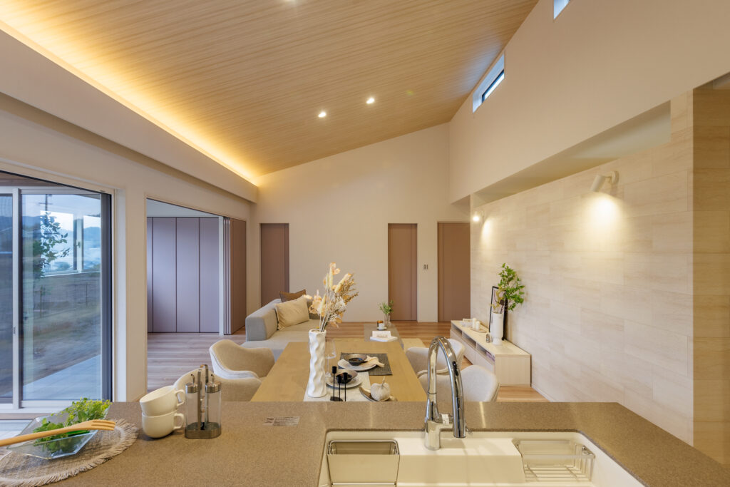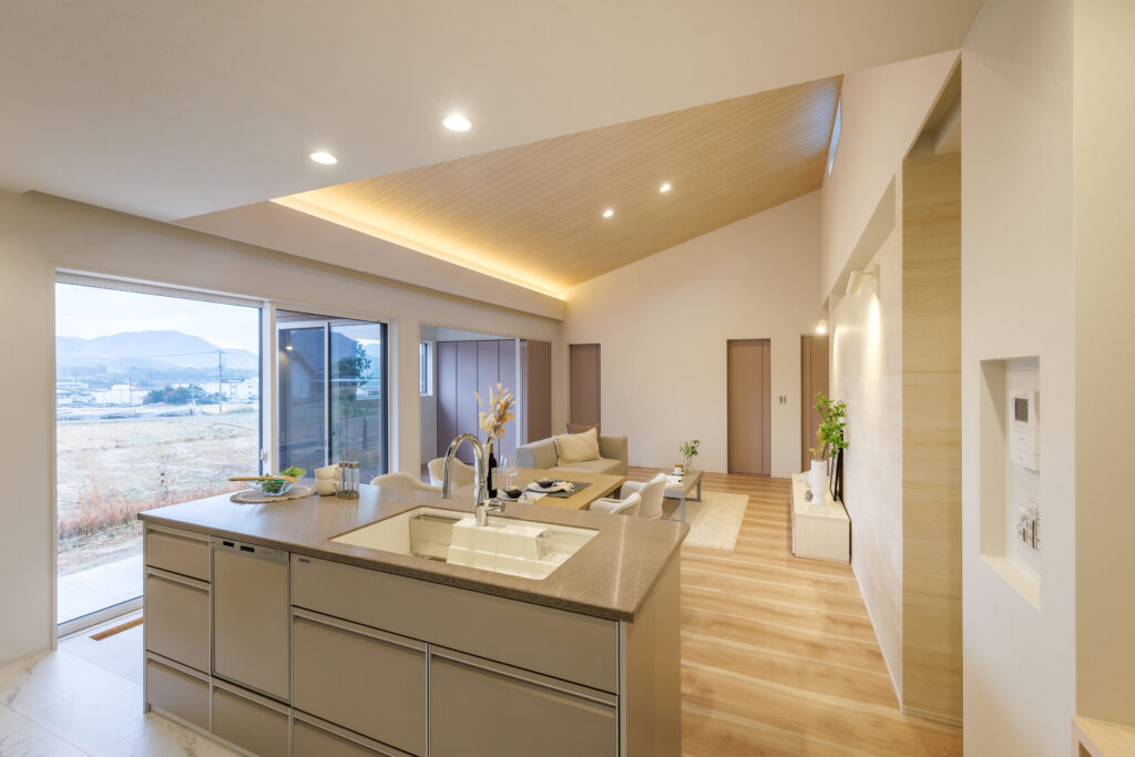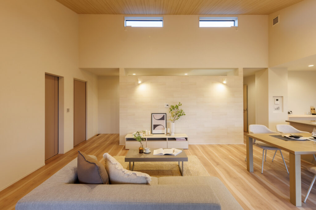 開放的な勾配天井のLDK 平屋 House Information 温熱性能 熱損失係数 Q値 1.40W/(㎡・K) 外皮性能 外皮平均熱貫流率 UA値 0.36W(㎡・K) 外皮性能 平均日射熱取得率 ηAC値 1.2 気密性能 相当隙間面積 C値 0.23cm²/㎡ お客様の声 Related Achievements 関連実績 注文住宅 HTTな暮らし 注文住宅 我が道を行く 注文住宅 愛するペットと暮らす癒しの住処